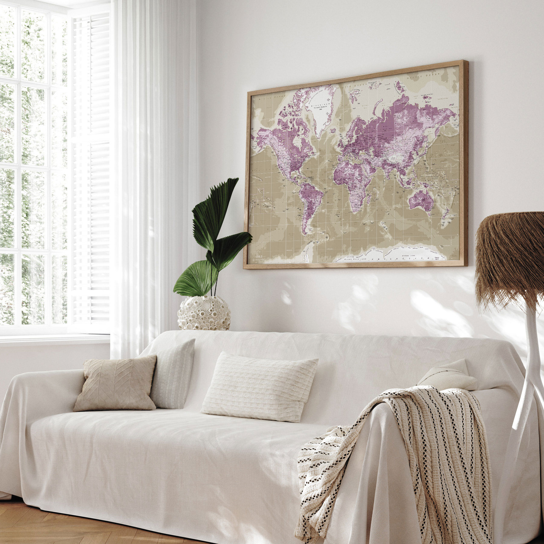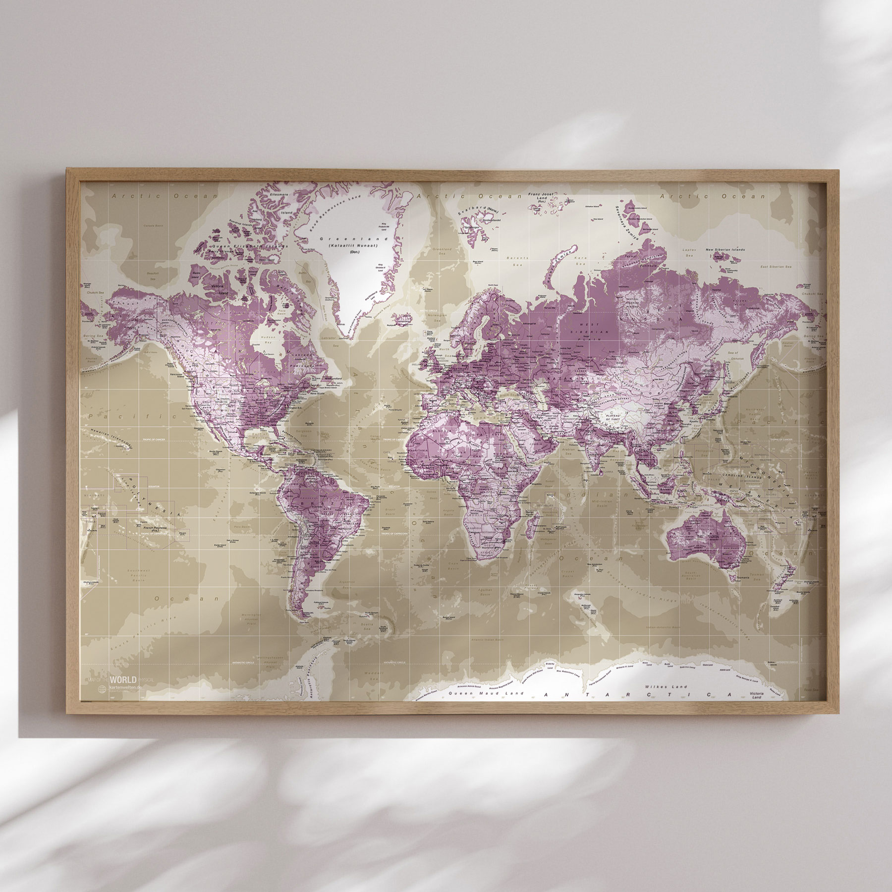 Et verdenskort i lilla og beige toner, der forener en farve med moderne elegance. "Purple" verdenskort har en smuk balance mellem detaljerigdom og stilrent design, hvor konturerne af kontinenter og lande står tydeligt frem.