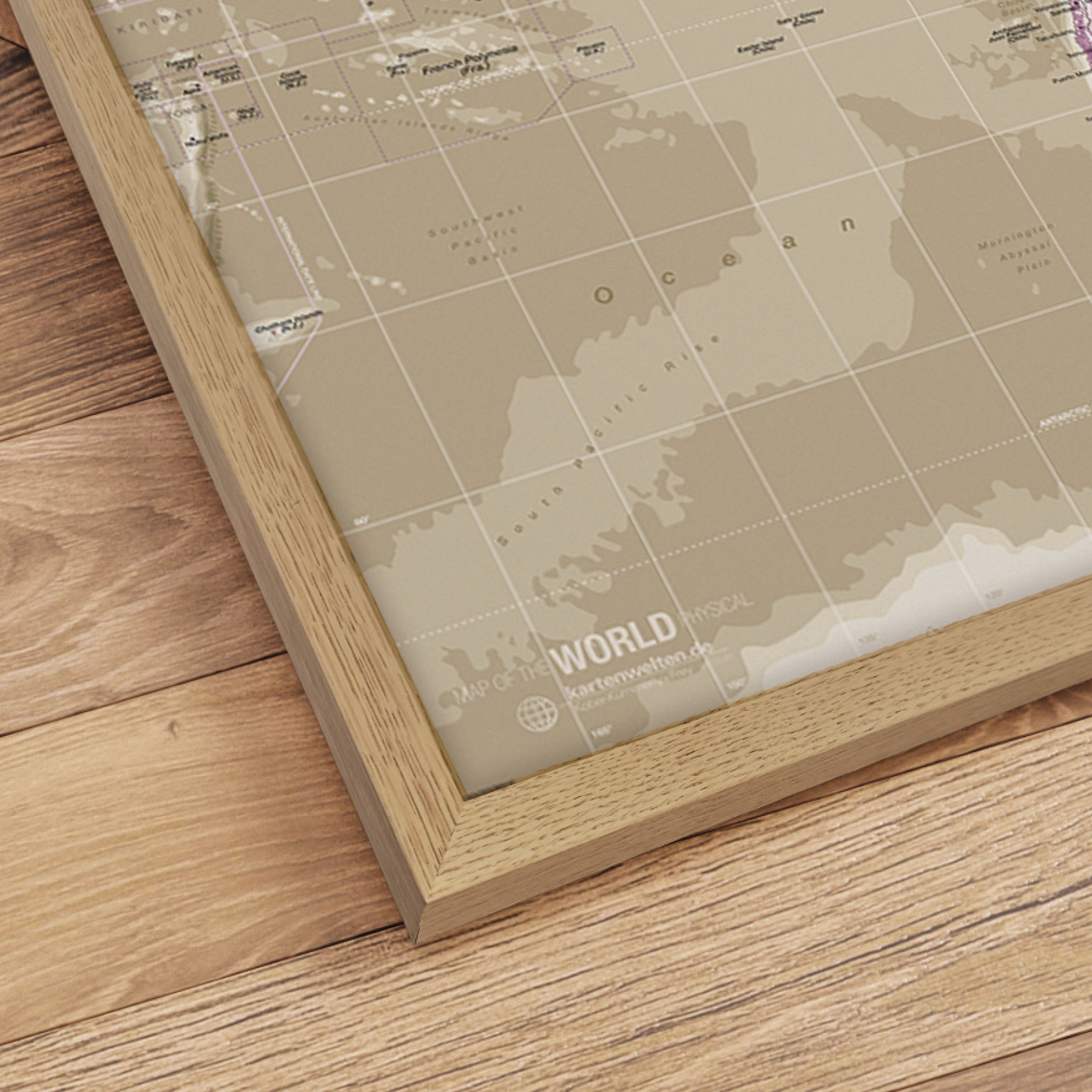Den unikke egetræsramme giver et raffineret udtryk, mens den matte laminerede overflade beskytter mod slid og refleksioner. Perfekt til hjemmet eller kontoret som en tidløs dekoration med geografisk præcision.
