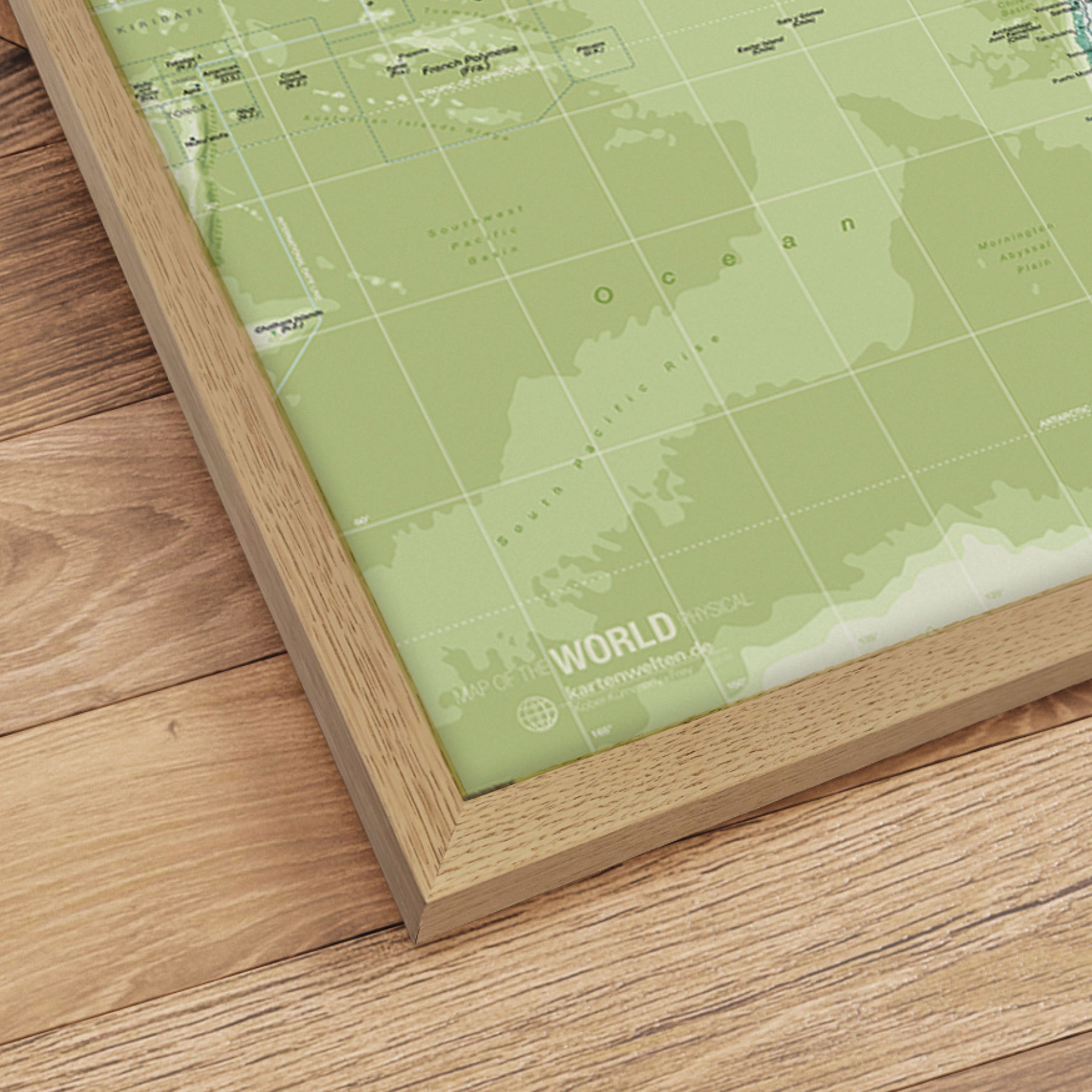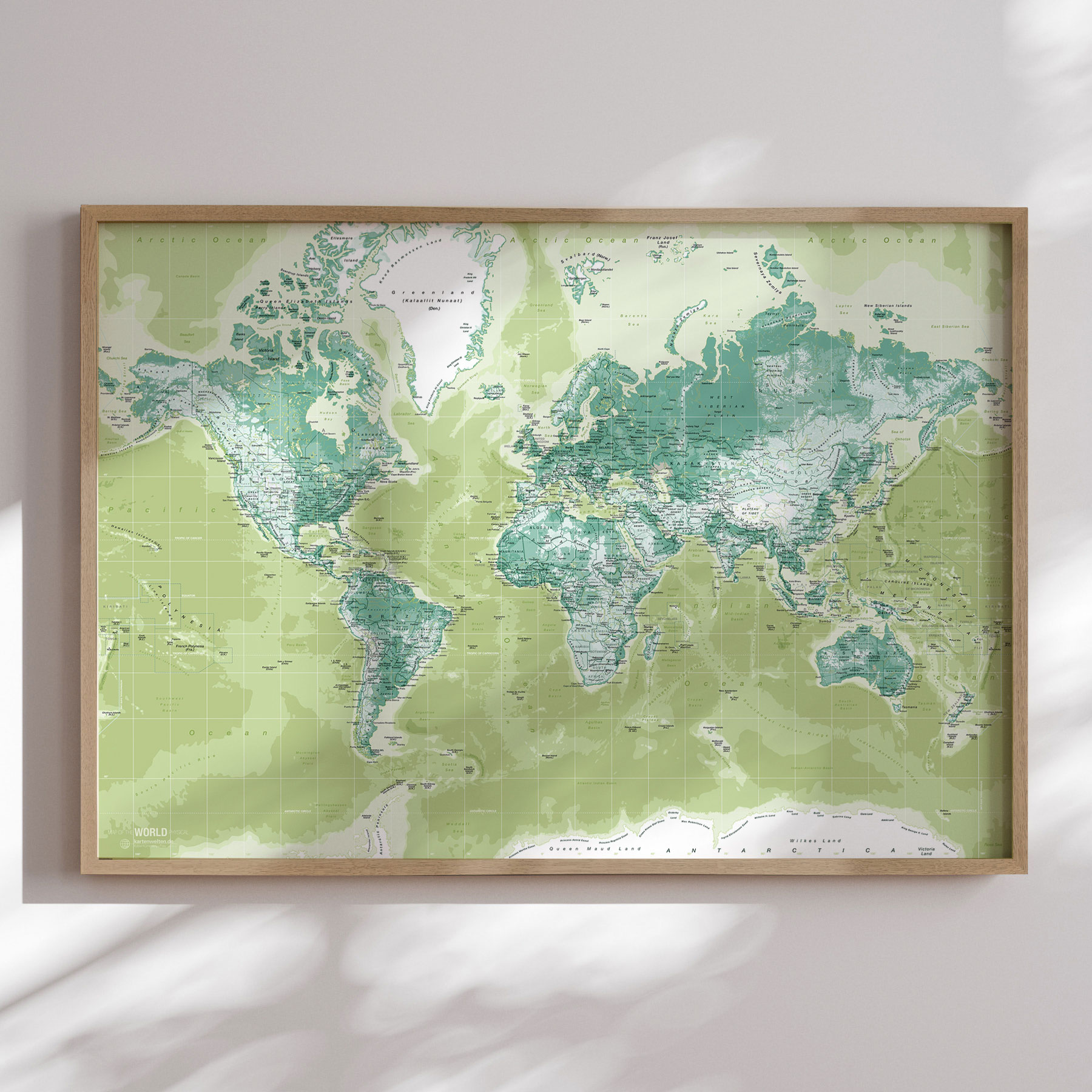 "Green" verdenskort forener lyse grønne toner med blålige kontinentlinjer, hvilket skaber en elegant og rolig atmosfære.
