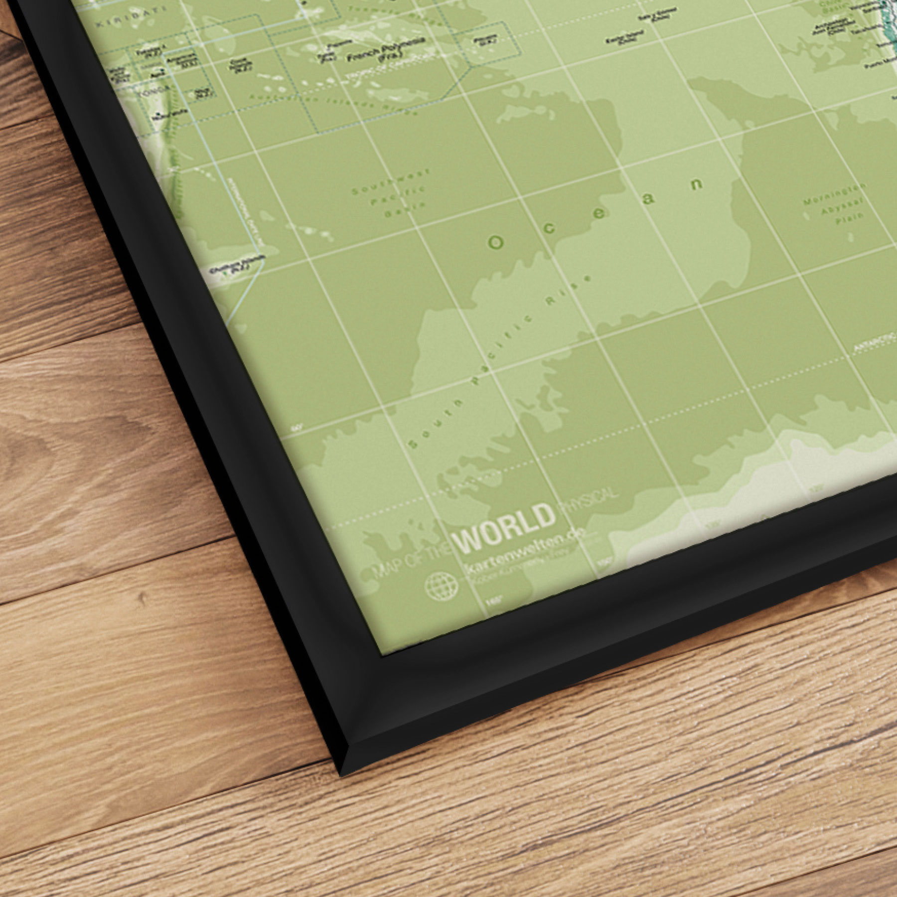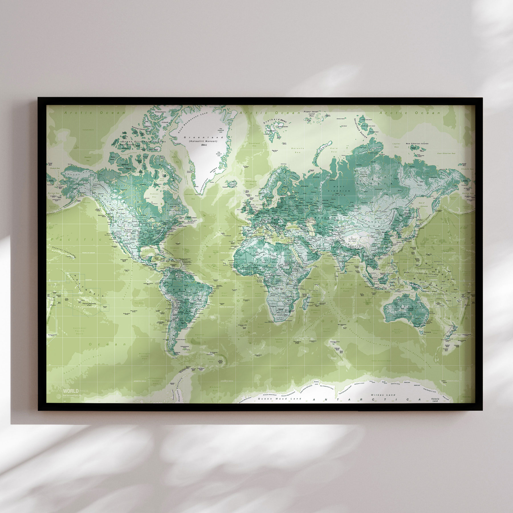 "Green" verdenskort forener lyse grønne toner med jordfarvede kontinentlinjer, hvilket skaber en elegant og rolig atmosfære.