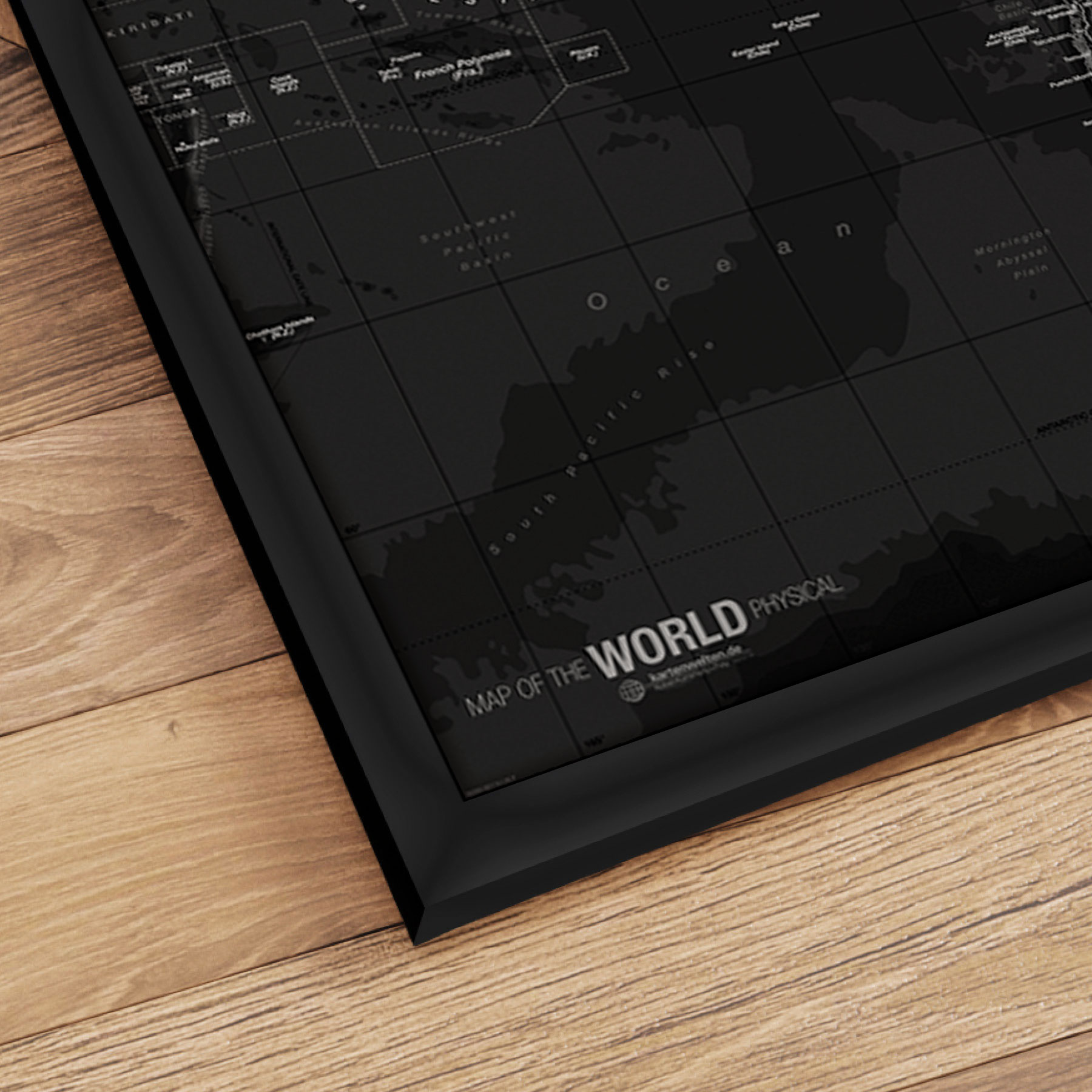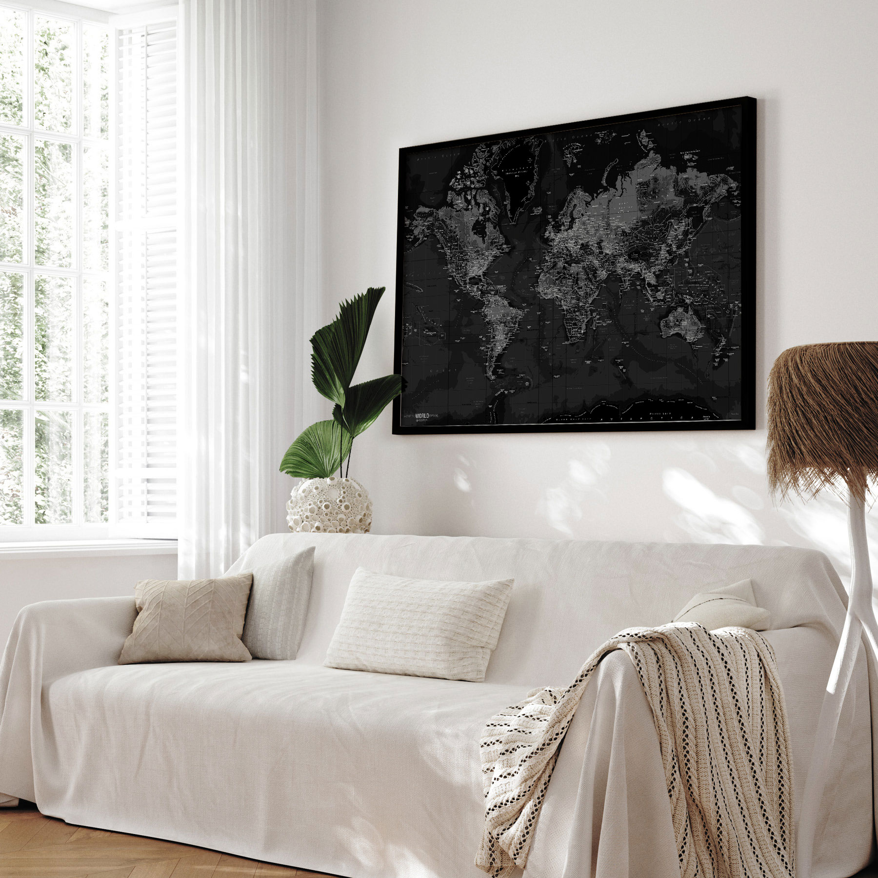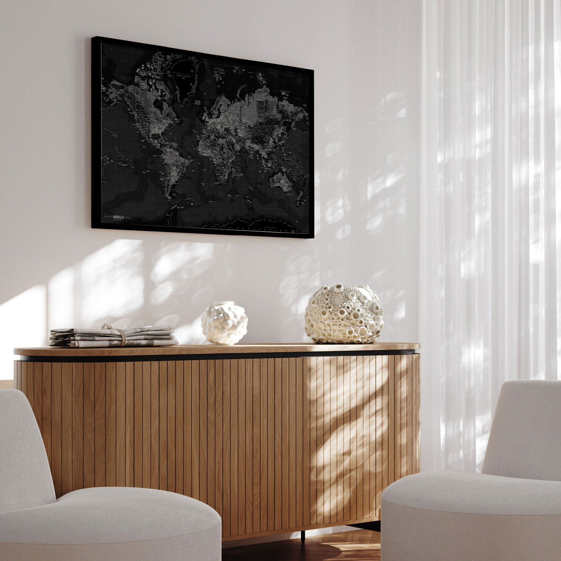 Et verdenskort med kant og karakter: "Dark" verdenskort præsenterer en dramatisk sort og grå farvepalette, hvor de fine detaljer skaber et sofistikeret og moderne udtryk.