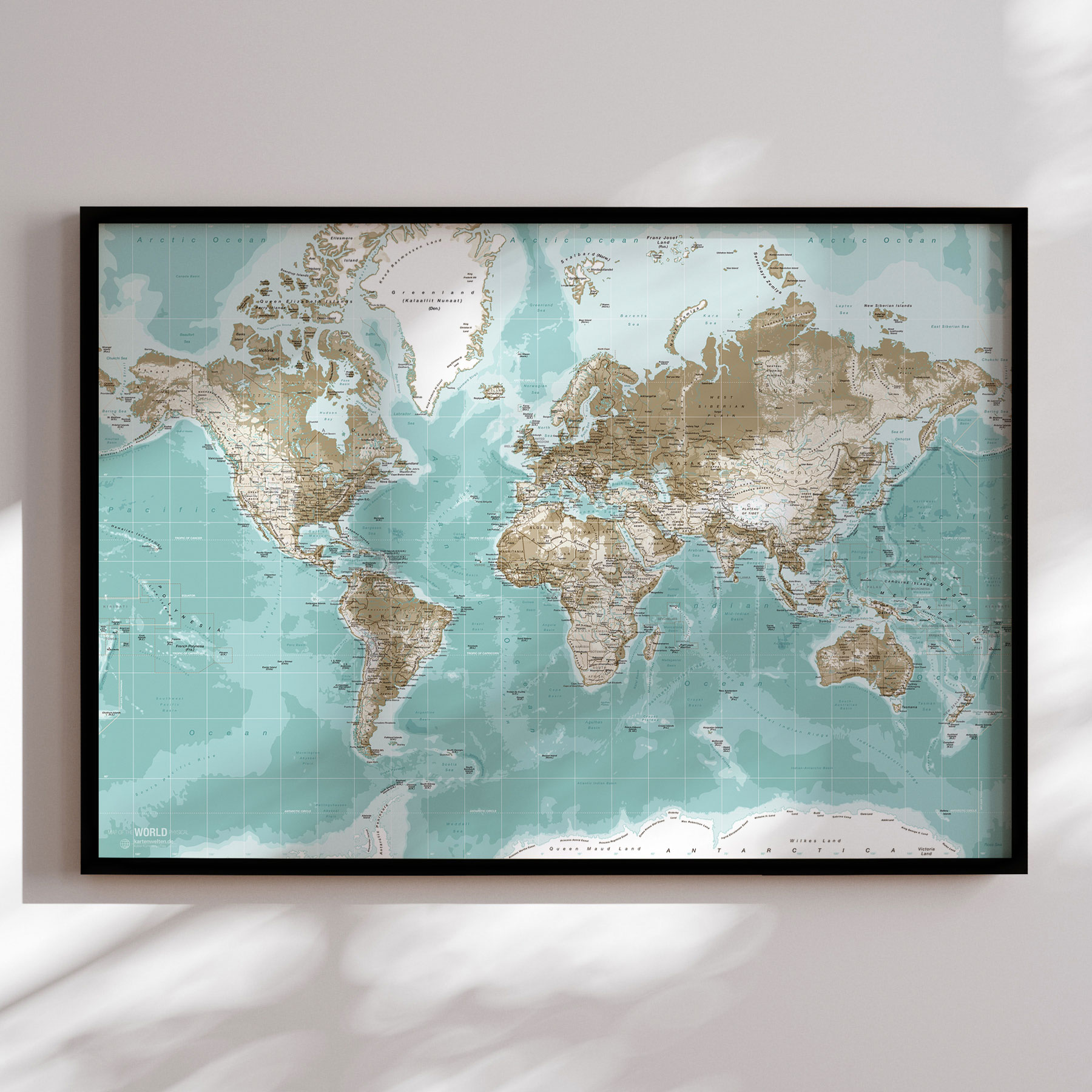 "Winter" verdenskort forener kølige blå toner med jordfarvede kontinentlinjer, hvilket skaber en elegant og rolig atmosfære. De subtile farvenuancer giver kortet et let og luftigt udtryk, mens de fine geografiske detaljer gør det både dekorativt og informativt. Den elegante sorte ramme tilfører den sidste finnish, og den matte laminerede overflade beskytter mod reflekser og slid. Et stilfuldt valg til både hjemmet og kontoret.