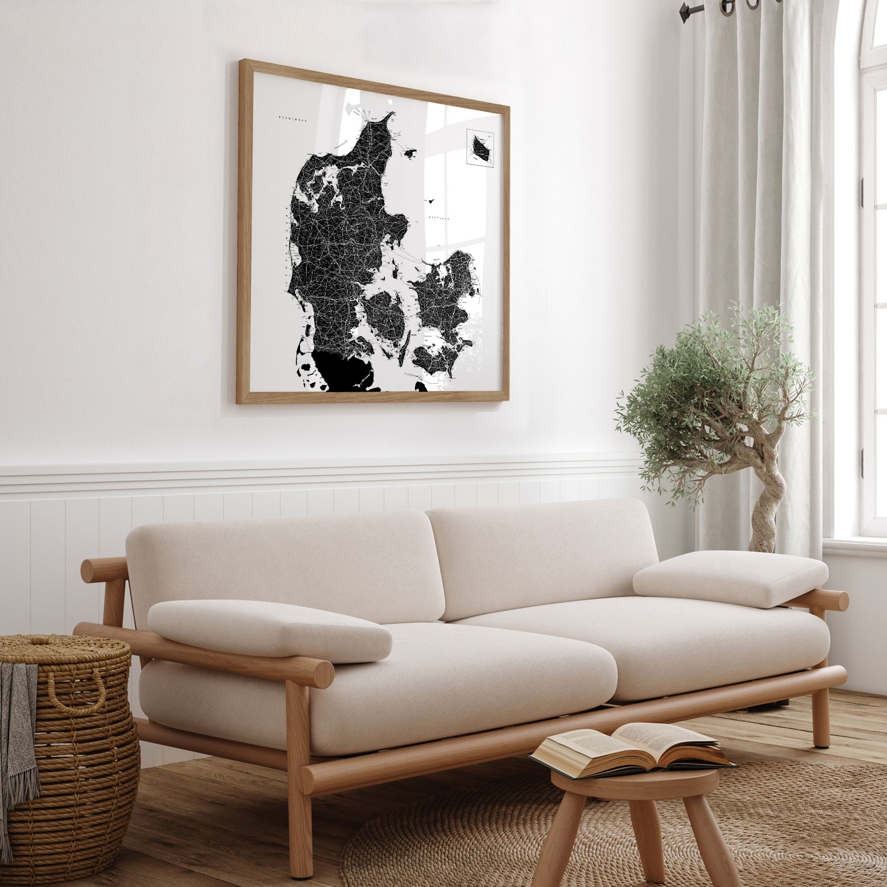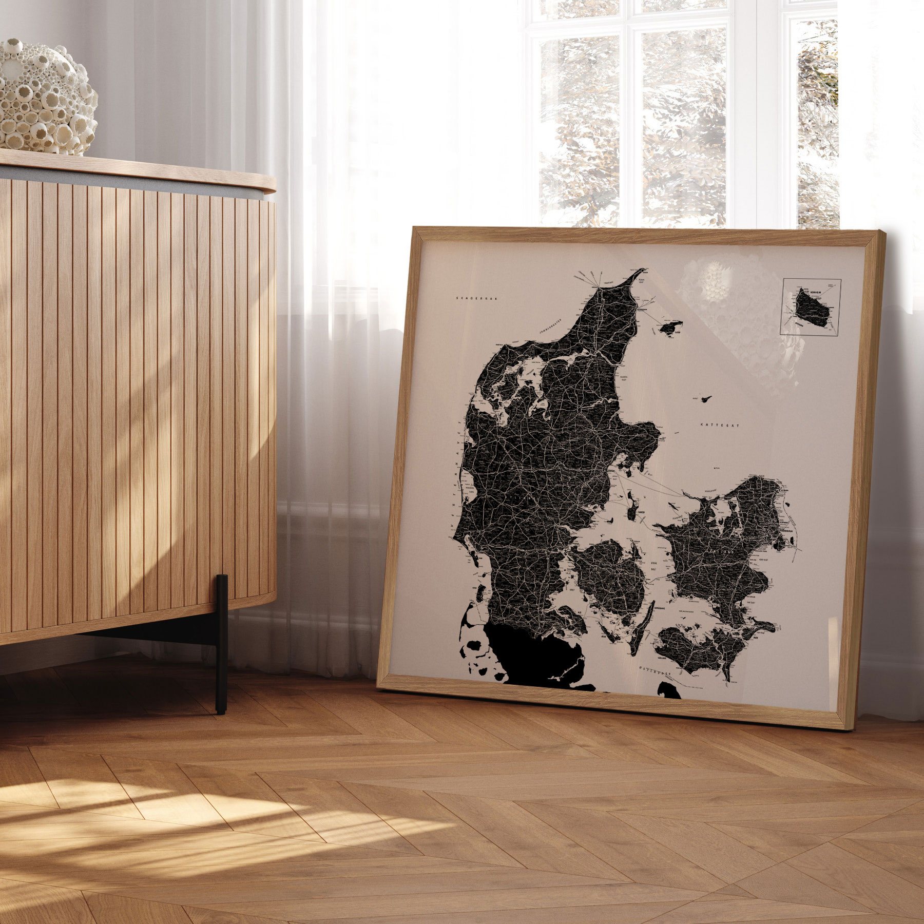 Udforsk Danmarks geografi med vores stilfulde plakat, der fremviser et flot Danmarkskort. De hvid og sorte farver tilfører et unikt og iøjnefaldende udtryk til din indretning. Vælg mellem tre størrelser for at finde det perfekte match til din indretning.
