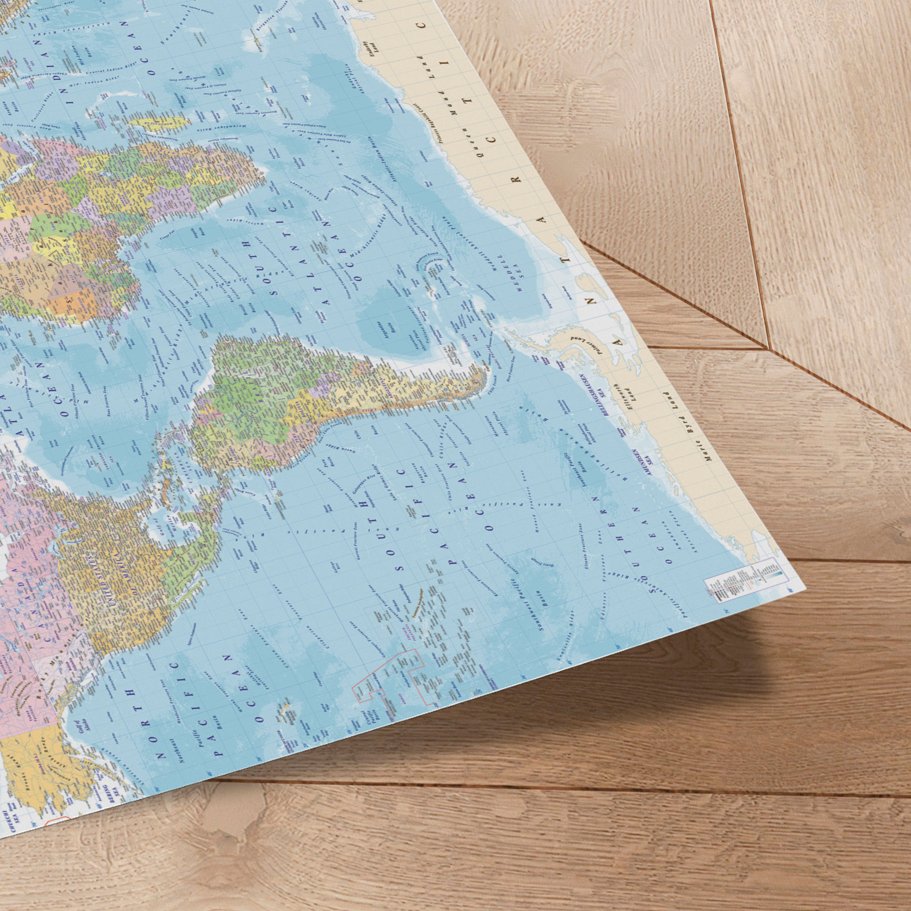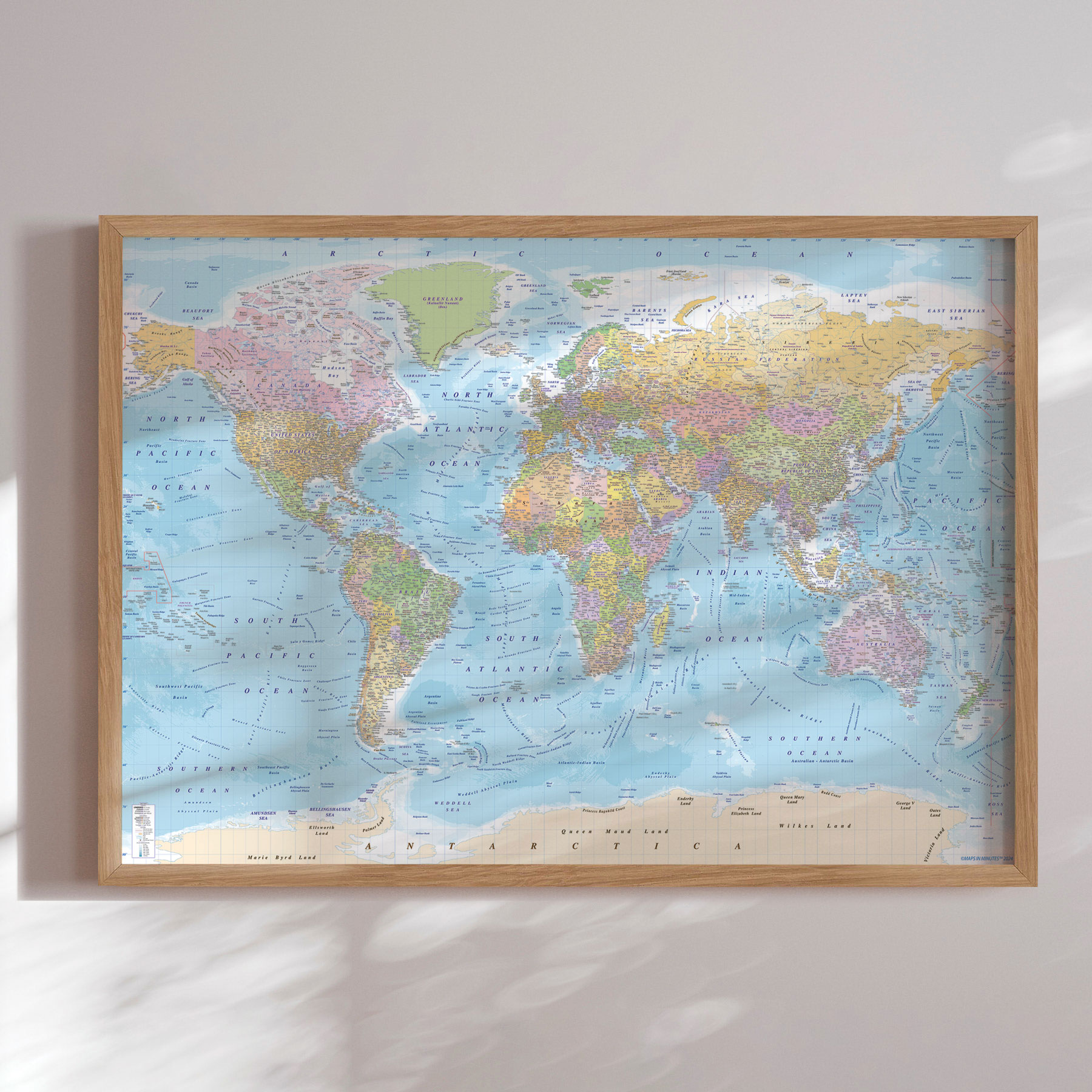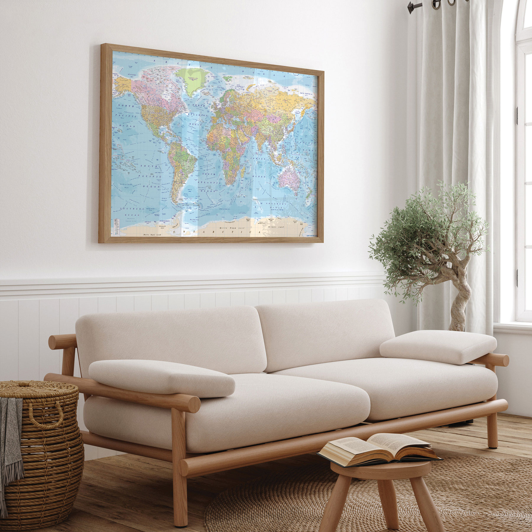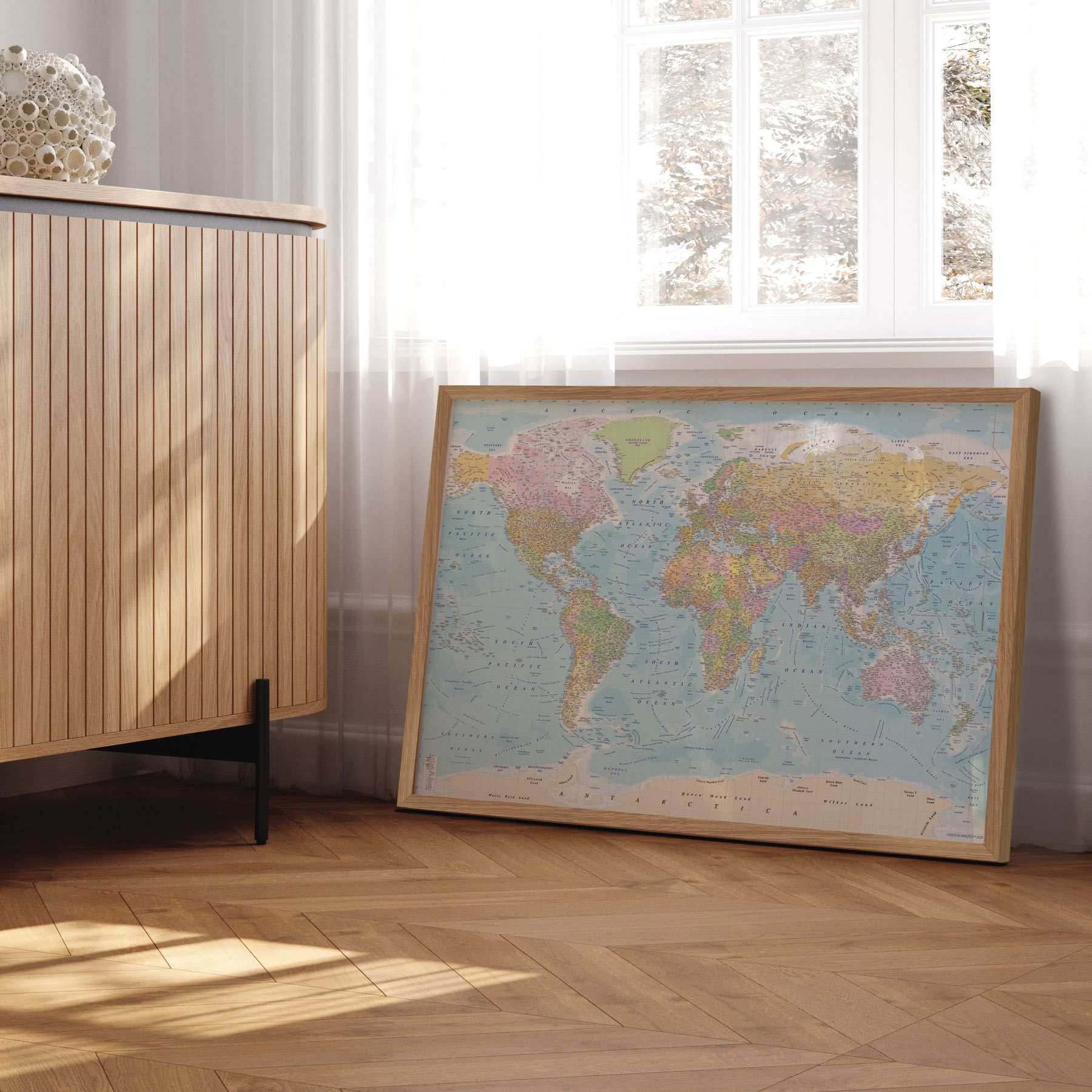 De omhyggelige detaljer giver et autentisk indblik i verdens lande, kontinenter og oceaner, mens de bløde nuancer skaber ro i rummet.