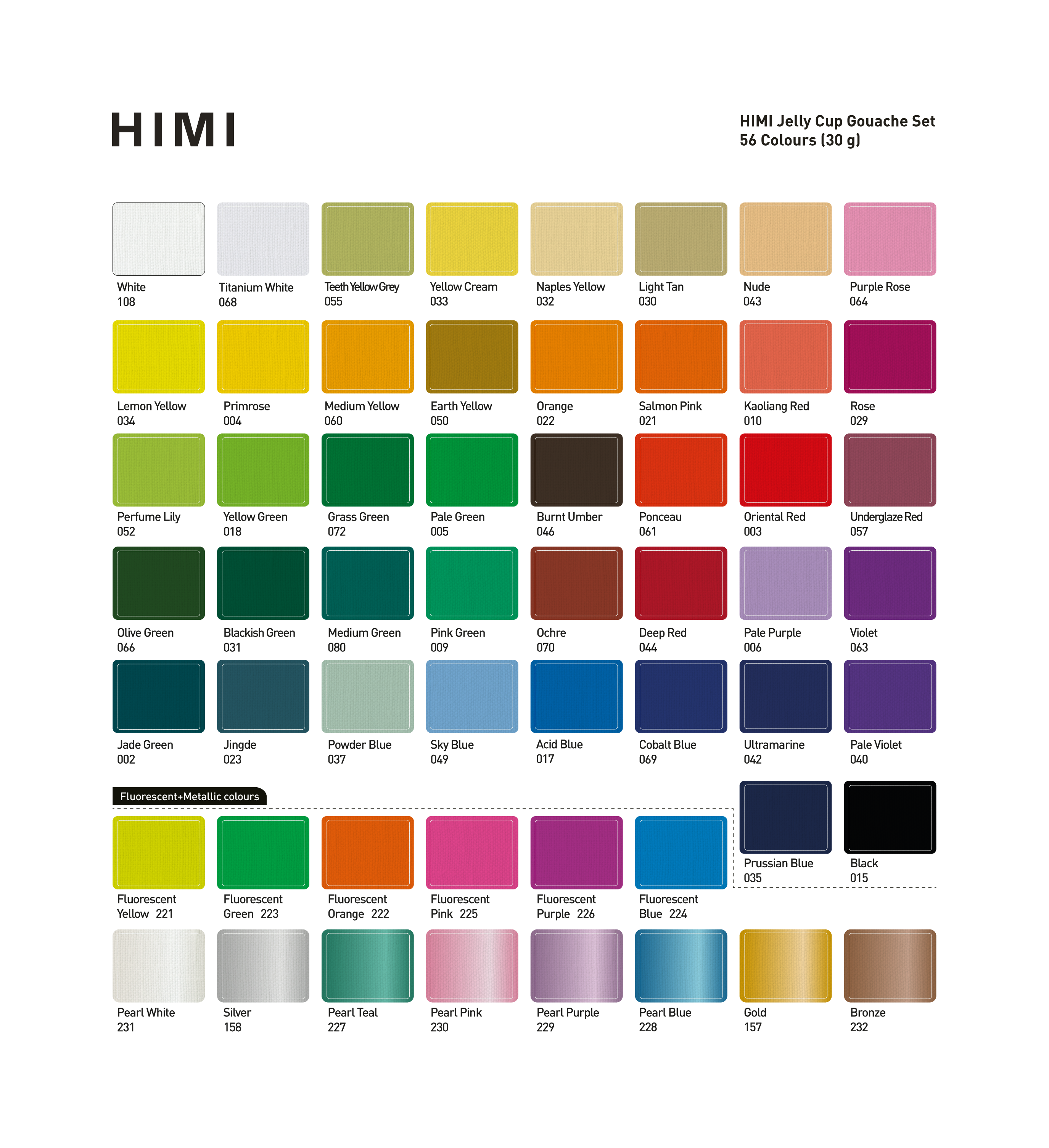 Det særlige ved HIMI’s såkaldte “jelly gouache” er den bløde, cremede konsistens og den konstante fugtighed, som gør, at farverne altid er klar til brug direkte fra koppen.