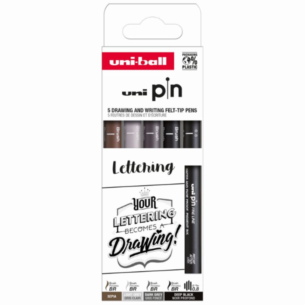 Dette sæt indeholder 5 Uni Pins i størrelserne: Brush sepia, brush light grey, brush dark grey, brush deep black & 0.8mm