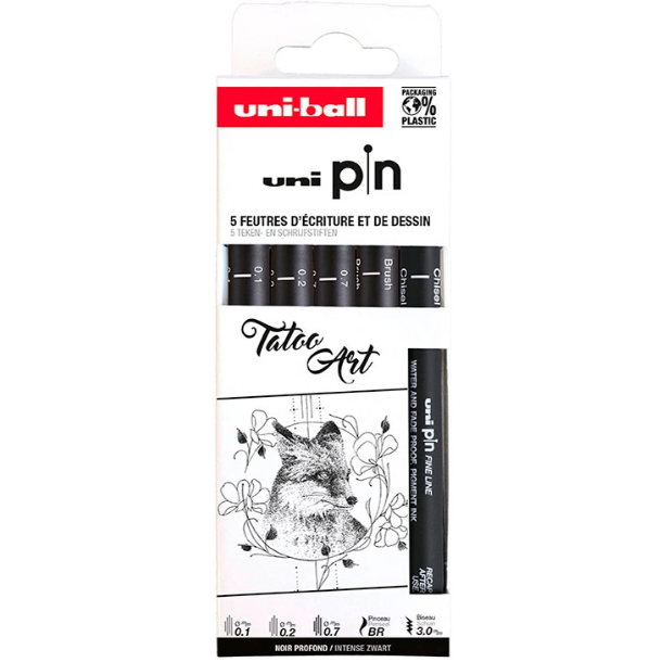 Dette sæt indeholder 5 Uni Pins alle i deep black og i størrelserne: chisel 3,0, brush, 0,1, 0,2 & 0,7.