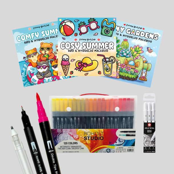Kreativpakke: 3 Cozy-malebøger + 120 vandbaserede tuscher + 3 gelpenne