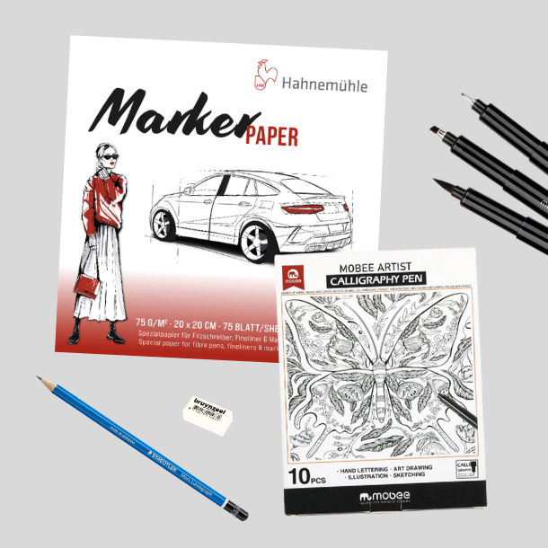 Hahnemühle højkvalitets markerpapir, designet specielt til brug med alkoholbaserede markere, tuscher og andre tegneredskaber. Papiret er særligt kendt for sin evne til at forhindre gennemtrængning af farver, hvilket gør det ideelt til detaljerede tegninger og illustrationer, hvor man ønsker rene linjer og klare farver uden risiko for blødning til bagsiden af arket.